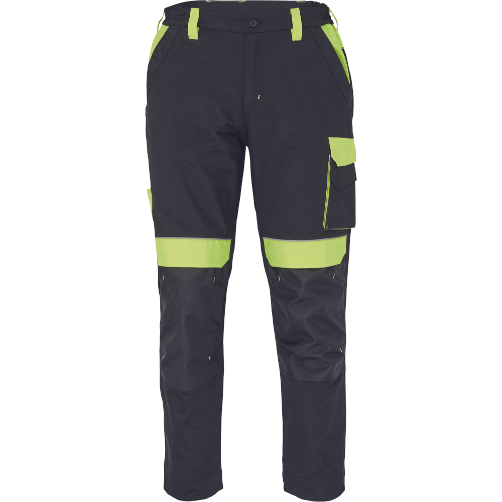 férfi munkanadrág rugalmas derékkal; 2 első zseb, 1 dupla oldalzseb a bal combon; 2 hátsó zseb; 2 kis hátsó zseb a jobb combon; fényvisszavető szegés; Oxford 600D megerősített térdrész, térdpárna tartó; a szárak hossza meghosszabbítható