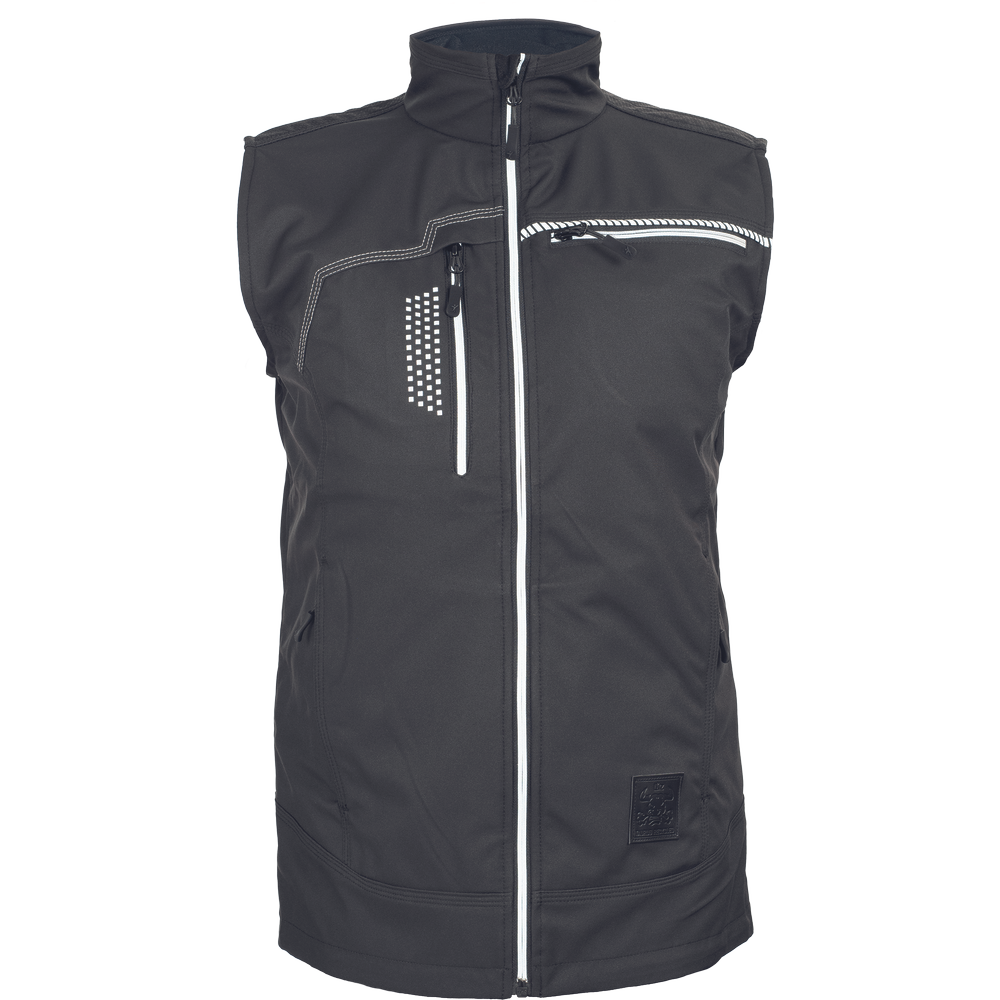men´s softshell vest in modern cut; reflex zipper in the front middle; Napoleon pocket with zipper on the right side (reflex zipper) with opening for earphones; Cordura reinforcement on the shoulders; contrast seam in light grey; interrupted signal piping as well as signal patch for safety & effect; name plateflap worked in on the left chest pocket.
