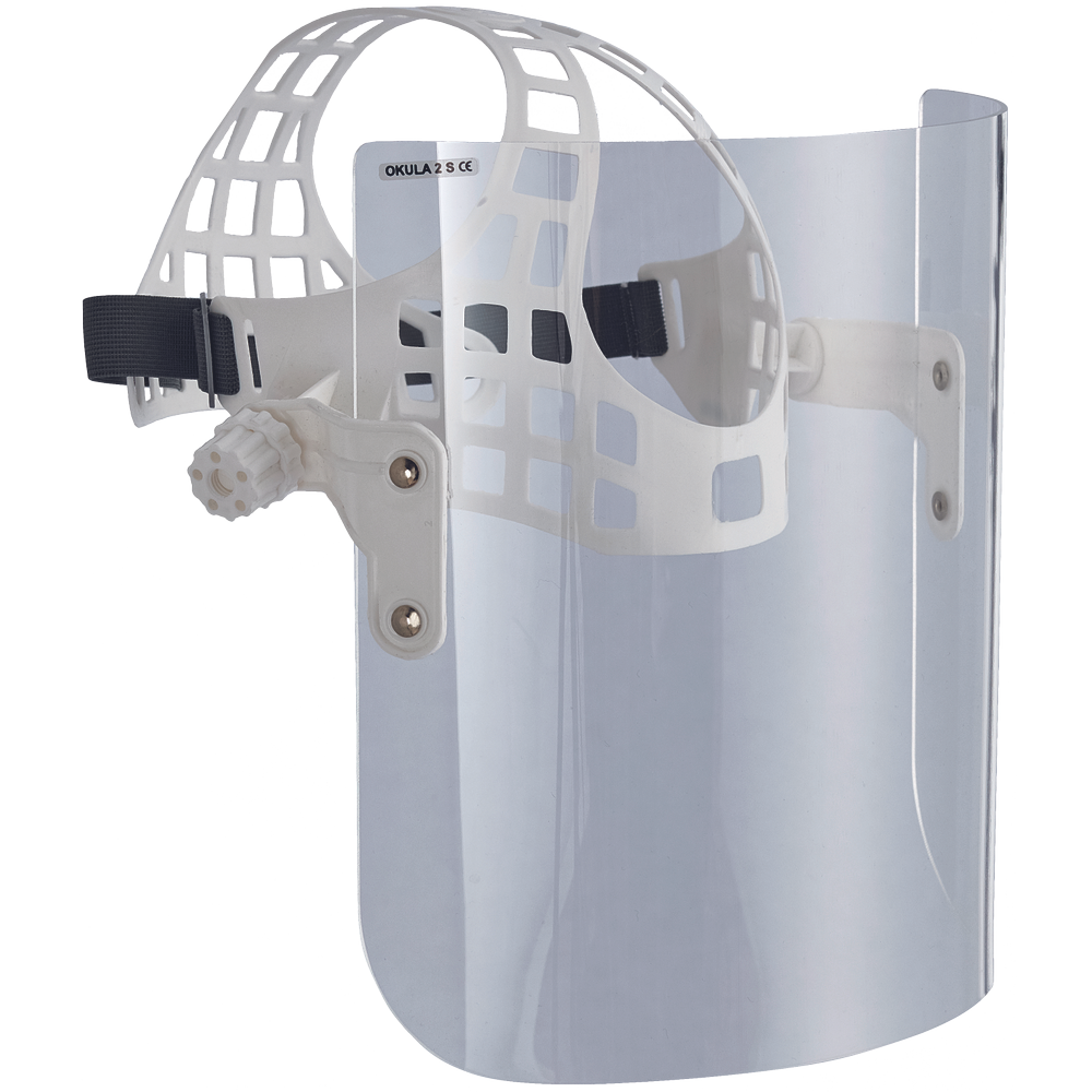 Arcvédő 220 x 290 mm víztiszta 2 mm vastag poli(metil-met) akrilát látómezővel, fejkerettel. Az arc és a szemek védelmére alkalmas kis méretű, alacsony energiájú (max. 0,56J) repülő szemcsék ellen. Használható korrekciós szemüveg felett viselve is. EN 166