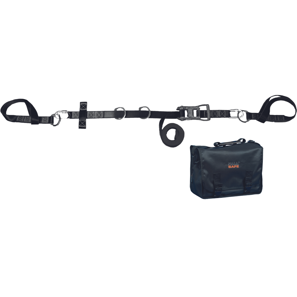 Fall safe SAFEWALK LIFELINE standards: EN 795: 2012 B length: 20 m weight: 4.6 kg CHARACTERISTICS: portable horizontal webbing lifeline system with the possibility of regulating the length and tightening the system using a ratchet, a portable bag is included USE: to create an anchor guide for 2 people